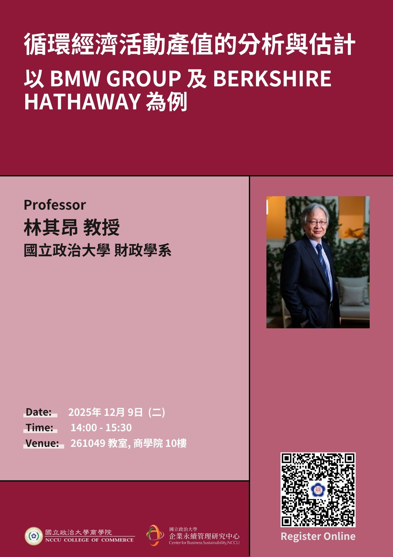 本次講座邀請政大財政系林其昂教授,以 BMW 與 Berkshire Hathaway 為案例,探討循環經濟活動的產值分析與估算方式。歡迎對永續經濟與企業實踐有興趣的師生踴躍參加。